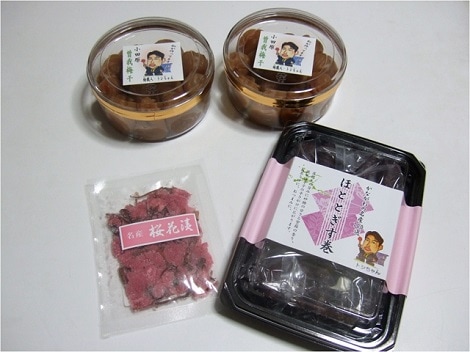 「かながわの名産100選」に選ばれた小田原曽我梅林の梅を添加物、保存料を使わず昔ながらの味に仕上げた「小田原曽我梅干」、食べた瞬間口に広がる落花生の旨みと甘み、しその香り、最後に広がる辛子の辛さが後を引く珍味「ほととぎす巻」、桜茶やご飯に混ぜて美味しい「桜花漬」のセットです。
