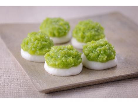【小福もち(ずんだ)】 宮城の郷土料理「ずんだ」で仕上げたお餅 透き通るような白さともっちりとした食感とコシが特徴のもち米「ヒメノモチ」に、栄養素が豊かな枝豆を粗めにすり潰し、宮城県の郷土料理で用いられる伝統的な製法で素材本来の旨味を活かし、甘さひかえめに仕上げました。 すべての餡、餅が無添加です。つくりたて新鮮をそのままに、冷凍発送でお届けいたします。