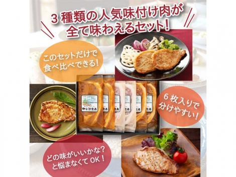 宮城県産豚のロース肉を、味噌・醤油・塩麹にそれぞれ漬け込み、発酵作用でしっとりやわらかく仕上げた逸品です。やさしい香りとコクが食欲を誘い、ごはんのお供にぴったり。冷蔵庫にて解凍の上、焼いてお召し上がりください。 ~お召し上がり方~ 1.冷凍室より冷蔵庫へ写し、1日置いて解凍します。 2.袋を開けて中からお肉を取り出します。 3.フライパンを熱し、熱くなったら薄く油をひきます。 4.フライパンに味付け肉を入れて中火で焼き、軽く焦げ目がついたらお肉を裏返します。 5.弱火にしてじっくり焼き上げてください。