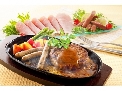 国産牛・豚肉を使用したやわらかな食感のハンバーグとデミグラスソースを中心に長期熟成のハムやウインナーも入ったバラエティ豊かなセット。