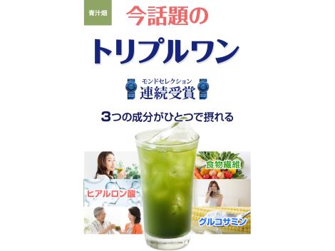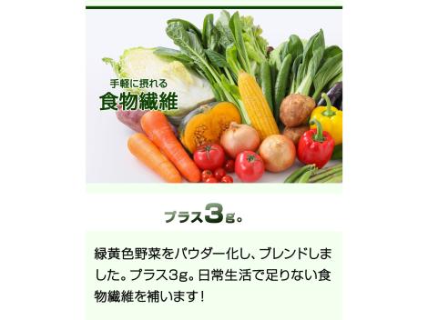 大麦若葉(国産)、マルチトール、難消化性デキストリン、マルトデキストリン、抹茶、明日葉、野菜ミックスパウダー(大麦若葉、ケール、さつまいも、ほうれん草、南瓜、人参、桑の葉、大葉)、緑茶エキス末、パラチノース、デキストリン、ヒアルロン酸/グルコサミン、プルラン、ビタミンC、甘味料(スクラロース)、香料