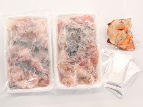 島根県産の天然アンコウの身・アラ・肝の詰め合わせセットになります。 約1.0kgのボリュームでおよそ4人前です。 あん肝、味噌ベースの鍋の素も付いているのでお鍋にさらにコクがでて、完成度が高まります。 天然の本アンコウ(キアンコウ)は、あっさりとした身で食べやすさが特徴的。 身と一緒にお送りするアラや皮部分には、女性に嬉しいコラーゲンが含まれており、鍋を楽しみながら美容も行える贅沢な魚です。 あん肝は「海のフォアグラ」とも称され、クリーミーで濃厚な味わいが特徴となっております。