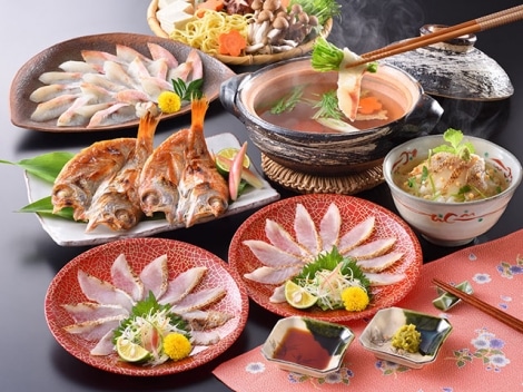 のどぐろしゃぶしゃぶ、のどぐろ炙り刺し、のどぐろ0℃熟成、様々なのどぐろ料理をお楽しみいただけます。 のどぐろ(アカムツ)は、「白身のトロ」と呼ばれるほどの上質な脂のり、そののどぐろから抽出しただしにしゃぶしゃぶ用の身をくぐらせてお召し上がりいただけます。 ※おすすめは、しゃぶしゃぶ用の身と水菜(季節の野菜)と一緒にお召し上がりください。 のどぐろの旨みと、季節の野菜から出た鍋の〆はちゃんぽん麺がおすすめです。 さらに炙ることで旨みを増すのどぐろの炙り刺しはポン酢でそのままお刺身として、お好みでゆず胡椒を加えても美味しく召し上がれます。 その炙り刺しを暖かいご飯にのせ、温めたストレートタイプ(100g)をかければお茶漬けとしてもお召し上がりいただけます。 0℃熟成は、0℃帯の環境で干しているので旨みが増し生感覚の干物、焼き上がりがふっくら仕上がります。 ※上手に焼くコツは、遠火でじっくり焼いて下さい。