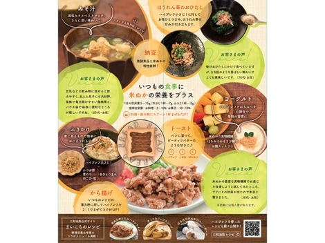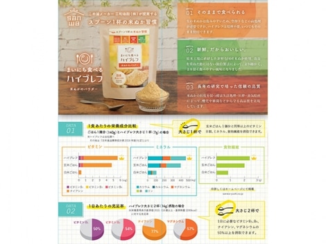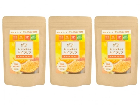 玄米のエッセンスが凝縮された"粉末状"の食品材料です。 人間の身体に必要な40種類以上の栄養成分がバランスよく含まれ、ビタミン、ミネラル、食物繊維に加え、特に米特有の生理活性成分が多く含まれています。 ※クッキー等の菓子やパンに、小麦粉のように種々の食品材料に混ぜて使用できます。 【まいにち食べるハイブレフの特徴】 玄米(米ぬか)の栄養価が高いことは知られていましたが、食材にするのがたいへん難しいものでした。ハイブレフは様々の技術革新でその困難をクリアし造られた製品です。 三和油脂の技術ノウハウを活かし、精米工場に直結した新鮮な国産玄米を使った世界初の低温圧搾製法によって安心で健康な食品素材が誕生しました。 美容・健康にお子様の栄養補給にもお召し上がりいただけます。