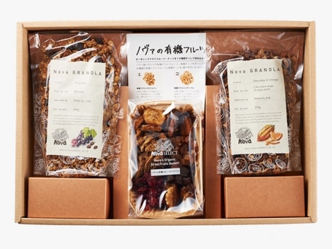 有機ドライフルーツ、ナッツ専門店のノヴァがお届けする初めてのドライフルーツミックス「ノヴァの有機フルーツバスケット」と、人気のオリジナルグラノーラ2種を詰め合わせました。 「ノヴァの有機フルーツバスケット」は、ノヴァ選りすぐりの素材10種類が天然ポプラの木箱にぎっしり。色々な種類のドライフルーツを少しずつ試したいというお客様のお声から商品化が実現しました。スティック状にカットしてあるため食べやすく、食べ応えもあります。牛乳やヨーグルトをかけて手軽に食べられる人気のグラノーラとあわせて、季節の贈り物や帰省のお土産にどうぞ。大切な方への贈り物にぴったりのギフトセットです。