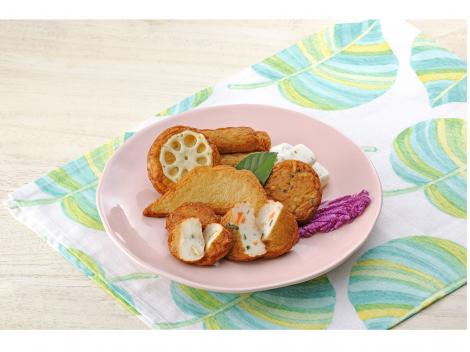 魚肉(外国製造、国内製造)、具材(れんこん、さつま芋、ごぼう、人参、にら、玉葱、しそ、黒ごま)発酵調味料、卵白(卵を含む)、砂糖、澱粉、小麦蛋白、食塩、ブドウ糖、魚介エキス、焼酎、地酒、食用菜種油/加工澱粉(小麦由来)、調味料(アミノ酸等)、保存料(ソルビン酸)