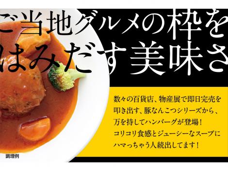 ■ハンバーグ:豚バラなんこつ、オニオンソテー(大豆を含む)、小麦粉、食塩、コショー、植物油(大豆を含む)、乳糖、にんにく、ぶどう糖、卵粉末、砂糖、セロリ/リン酸塩(Na)、調味料(アミノ酸等)、増粘多糖類
