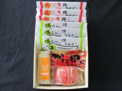 創業昭和38年。 貴千では、解凍室を使わず、あえて原料のすり身を常温で解凍しております。職人たちがすり身の温度、解凍時間等を四季に応じて管理し、すり身の力を最大限に引出せる状態を作り出して製造しております。また、「海の美味しさを食卓に」をモットーに毎日かまぼこを美味しく食べられるように、素材の味を引出した商品造りを心がけております。 私たちがかまぼこ造りを通して改めて気づいたことは、かけがえのない「ふるさと」の存在でした。おいしく、安心安全に食べられるだけでなく、かまぼこの中に、地域の歴史や風土、文化をも摺り込んでいきたいと考えております。 かまぼこをつくるということは、ふるさとのよさを引出し、ふるさとを摺るということです。父祖伝来の技術にさらに磨きをかけ、進取の気性を取り入れながら、いわきの歴史、風土、文化、そして人と真っ正面から向き合い、ふるさとをおいしく摺っていきます。 『かまぼこの身をかにの甲らにつめ、表面に紅ズワイガニを贅沢に隙間なくはったかに甲らかまぼこ、「めひかり・キンキ」をかまぼこの身に練り込み魚の形に焼いた焼かまぼこ等が入った詰合せです。』 ■ワインによく合うかまぼこスモークサーモン チーズをたっぷり練り込んだかまぼこの身に、スモークサーモンとパセリを混ぜました。おつまみに最適で特にワインとの相性が抜群です。 ■かに甲らかまぼこ たら・ぐちのすり身を石うすで丹念に練り上げたかまぼこの身をかに甲らの中にギュッと詰め、表面に隙間なく紅ズワイガニをはりました。紅ズワイガニの風味豊かなかまぼこです。 ■めひかり焼かまぼこ いわき市のシンボルとして広く市民に愛されている「めひかり」を使用し、定番の焼かまぼこを作りました。めひかりは皮と身の間の部分に特に脂がのっているので、皮ごとかまぼこの身に混ぜ、うまみを逃さず焼き上げました。子供たちのおやつに最適です。 ■キンキ焼かまぼこ 白身の高級魚・キンキを練り込んだ贅沢な焼きかまぼこです。トースターなどで軽く焼き、マヨネーズをつけたり、七味唐辛子をかけてお召し上がりいただきますとよりおいしくお召し上がりいただけます。