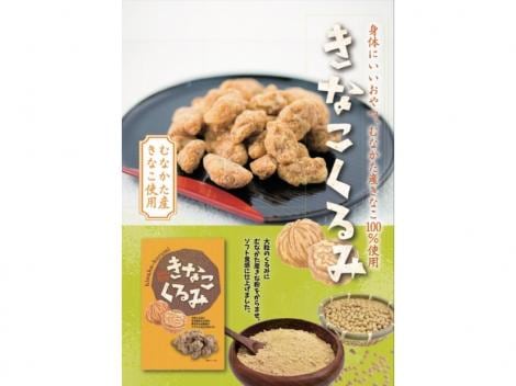 熊本銘菓「あんたがたどこさ」でお馴染みの老舗製菓会社・岩田コーポレーションさんと「道の駅むなかた」とのコラボレーション商品です。 宗像産の大豆「フクユタカ」を昔ながらの製法で加工したきなこを100%使い、大粒のくるみを包み込んで、ソフトな食感に仕上げました。 袋を開けると、風味豊かな宗像産のきなこの香ばしい香りが広がり、沖縄産の黒糖のやさしい自然な甘さの味わいは、つい手を伸ばしたくなること間違いなしです!