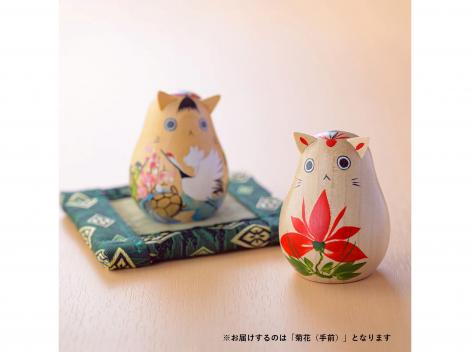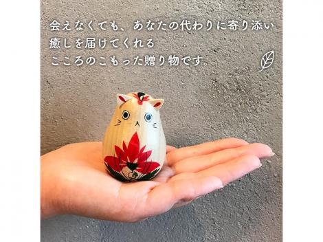 宮城県の伝統工芸品「鳴子こけし」と猫をモチーフにした、手のひらサイズのこけしです。 手に馴染むような柔らかな曲線と、愛らしい表情がチャームポイント♪ 絵柄は鳴子こけしの伝統的な絵柄である「菊花」。 おしゃれなインテリアとして、玄関やお部屋に飾るのもおすすめです。 また、お祝い事や感謝の気持ちを伝える贈り物にぴったりの「ねこけし」。 特に猫好きのご両親や、お友達に喜んでいただけるアイテムです! ■手作りならではの希少性・オンリーワンの存在 「ねこけし」は、ひとつひとつまごころを込めて手作りされています。 そのため、傾きや木目・絵付けなど、全く同じものはありません。 手作りならではの風合いや温かさを感じられるとともに、ひとつとして同じものはない、特別なアイテムです。 また、手作りであるがゆえに、週に数体しか製造できないため、非常に希少な逸品となっています。 ■お部屋に馴染みやすいデザイン性 つい手に乗せたくなるような柔らかな曲線と、場所を取らないコンパクトなサイズ感。 やさしい天然木のナチュラルな味わいはどんなインテリアにも馴染みます。 ■幸せの贈り物 こけしも猫も、縁起がいいものとして古くから親しまれています。 誕生日や結婚祝いなど、あらゆるお祝いごとの贈り物におすすめのアイテムです。 また、お部屋や身近なところに飾れば、愛らしい表情に癒されて、幸せも招いてくれるかも…。