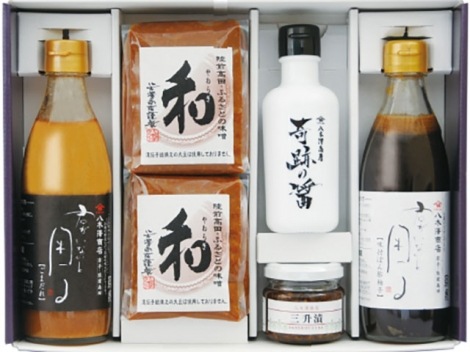 ごまだれ410g×1本、和味噌500g×2個、奇跡の醤150ml×1本、三升漬75g×1個、味付ぽん酢柚子415g×1本