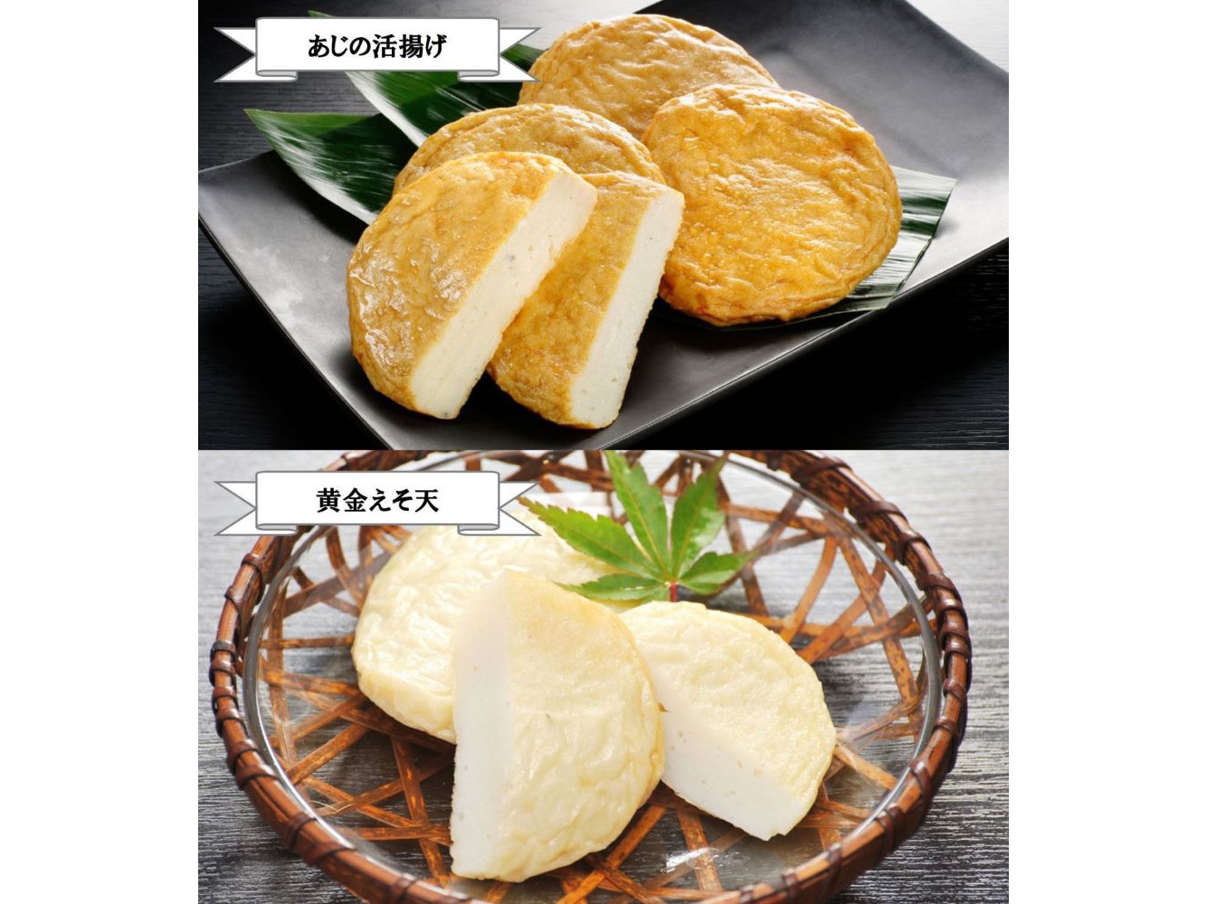 ■黄金えそ天:魚肉(えそ(長崎県)、スケソウダラ)、馬鈴薯でん粉、食塩、砂糖、卵、菜種油/調味料(アミノ酸等)