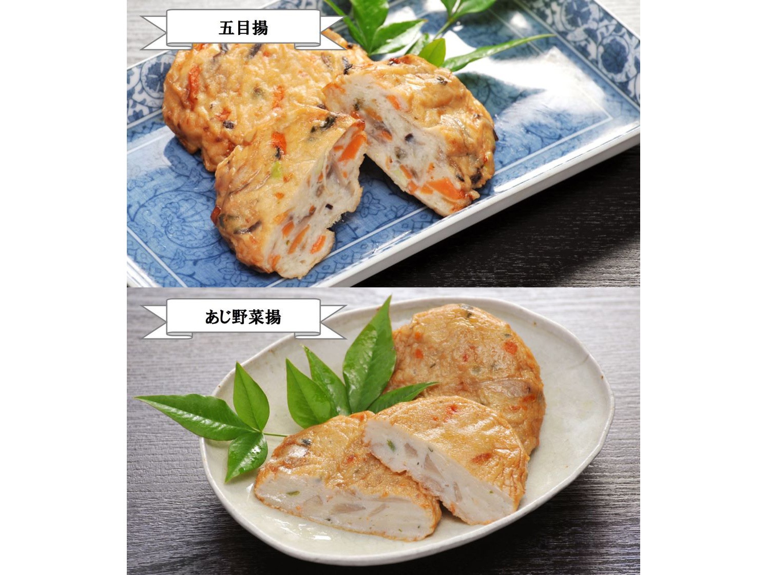 ■五目揚:魚肉(スケソウダラ(国産))、植物性たんぱく(大豆)、ごぼう、人参、枝豆、わかめ、きくらげ、馬鈴薯でん粉、食塩、砂糖、卵、菜種油/調味料(アミノ酸等)