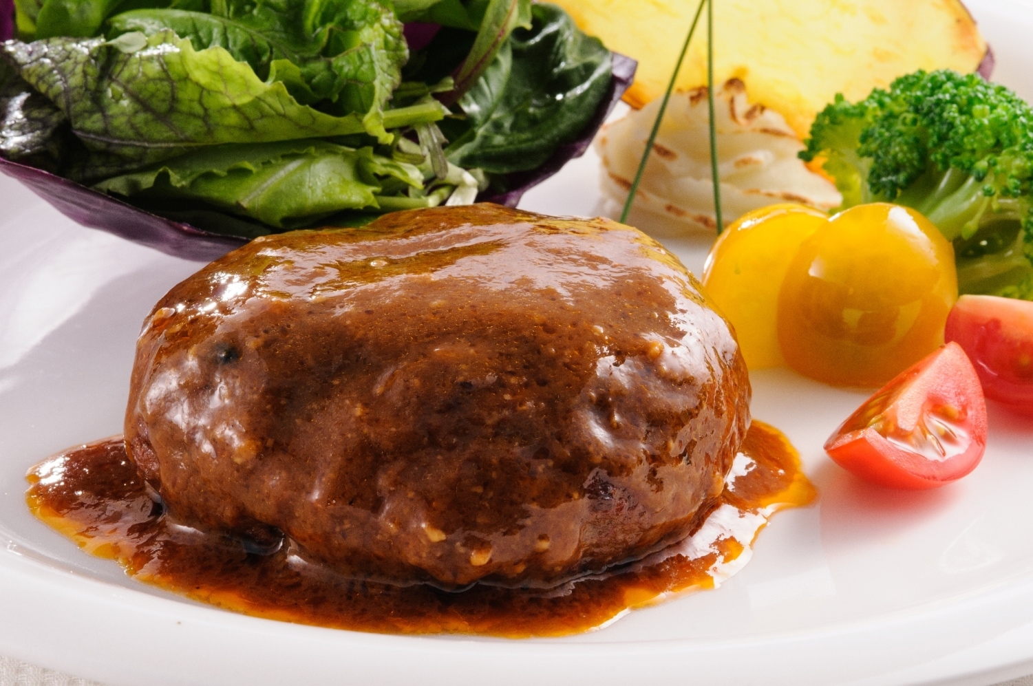 蔵王牛の牛肉を100%贅沢に使用した本格的なハンバーグを特製デミ味噌で煮込み丁寧に仕上げました。