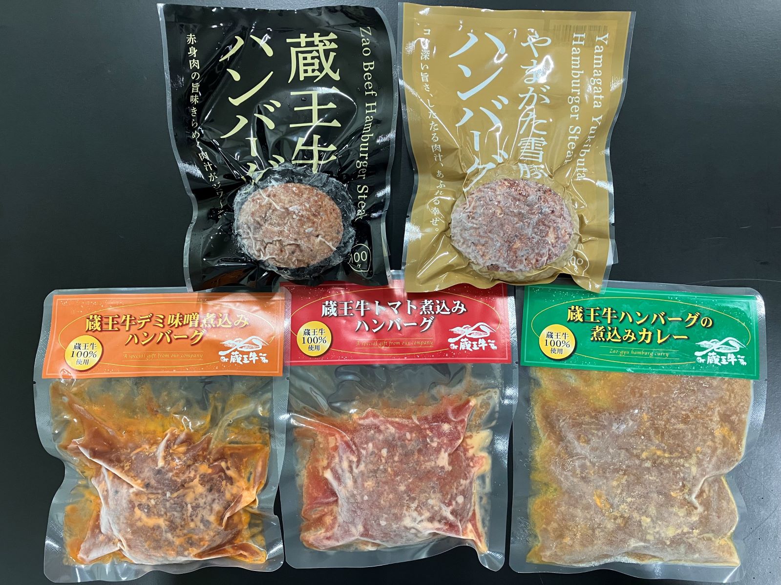 ■蔵王牛ハンバーグ:牛肉(宮城県産)、玉ねぎ(国産)、つなぎ(パン粉、鶏卵)、食塩、香辛料、(一部に牛肉・小麦・卵を含む)