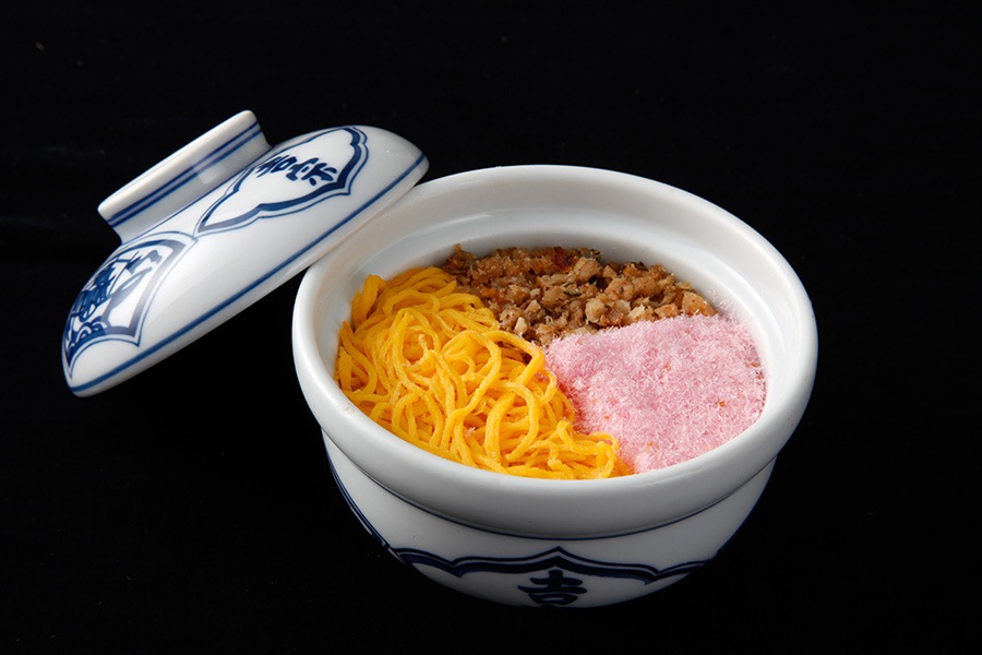 穴子をはじめ、鶏肉、しいたけ、きくらげ、ぎんなん、たけのこ、蒲鉾、麩、えびなど十種類の吟味された材料と味加減は、百五拾有余年の伝統の味がそのまま生きている名物のひとつです。