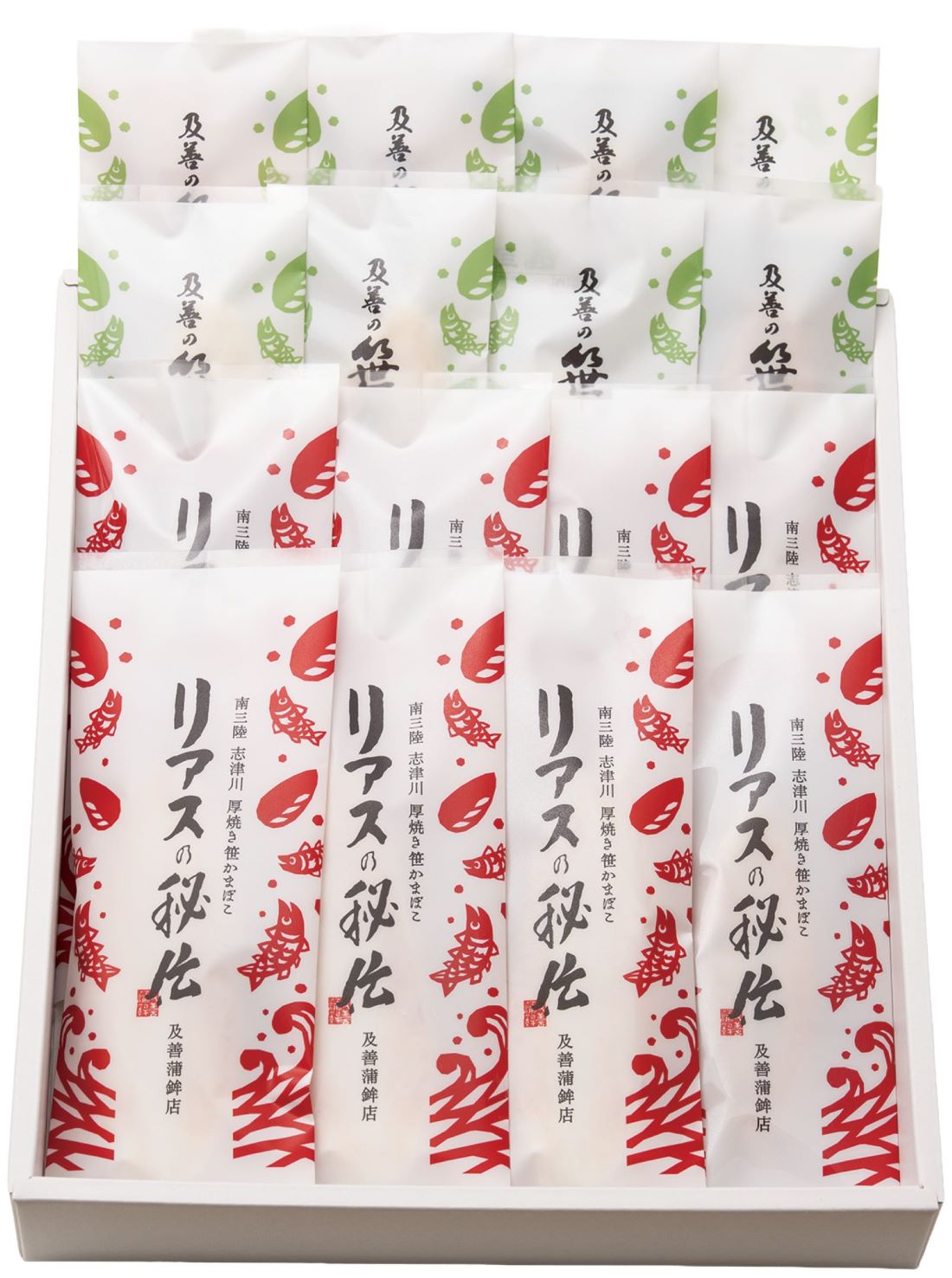 ■リアスの秘伝:魚肉(輸入または国産)、卵白、砂糖、食塩、清酒、みりん/加工澱粉、調味料(アミノ酸等)(一部に卵、さば、大豆を含む)