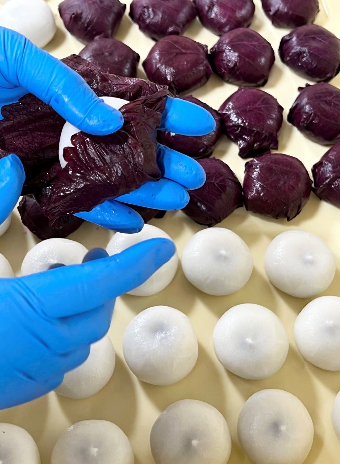 限定で販売しているしそもちは、自家製餡と米粉で作ったなめらかなしろもちに、ひとつひとつ丁寧に国産しその葉の塩漬けを巻いた人気商品です。